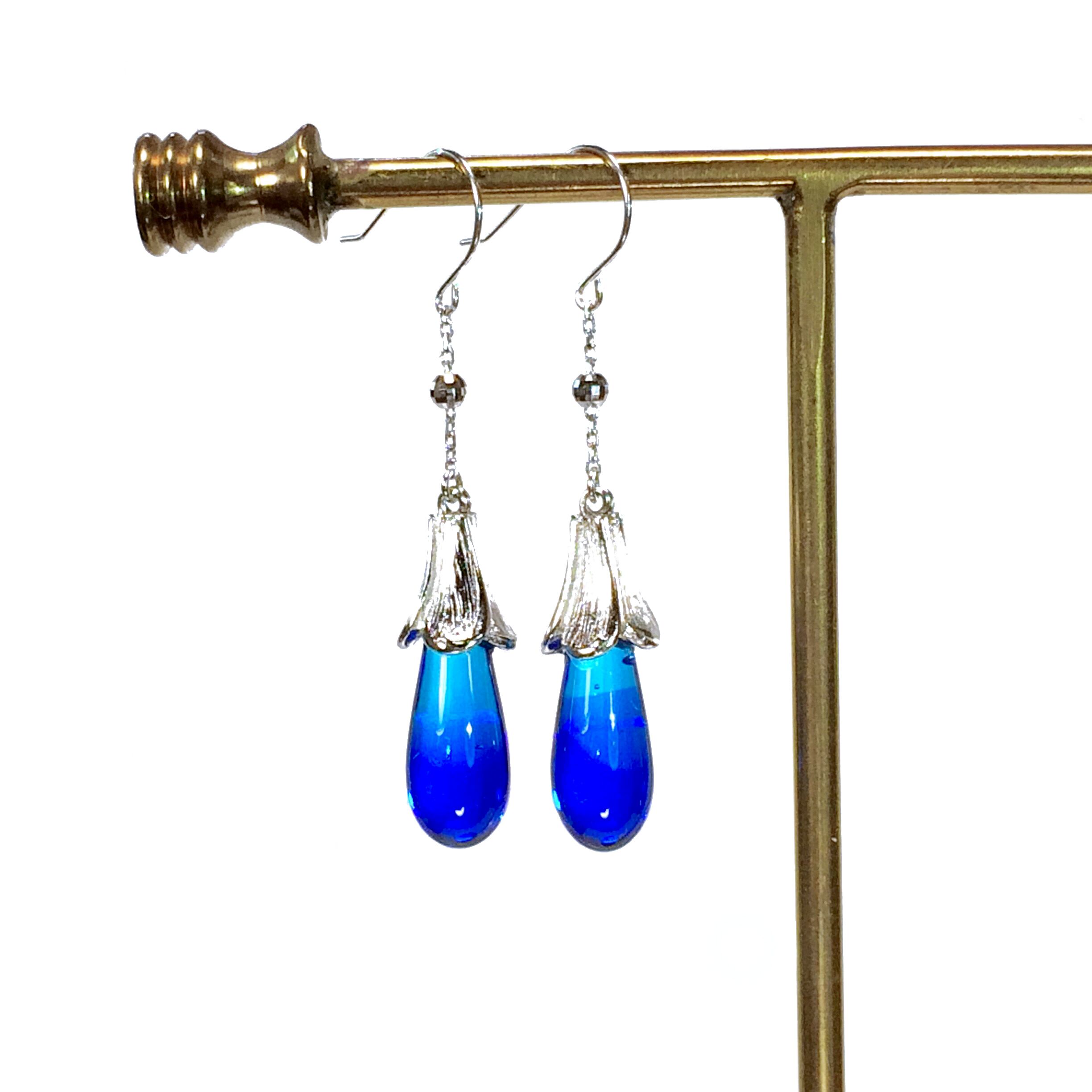 夜空のように深く美しいコバルトブルーが上品な、K10ホワイトゴールドのティアガラスピアス。小ぶりの愛らしいティアガラスが、耳元で上品に揺れ輝きます。雫のような優しい曲線に、光があつまりキラキラ煌めく美しい輝きをお楽しみ下さい☆