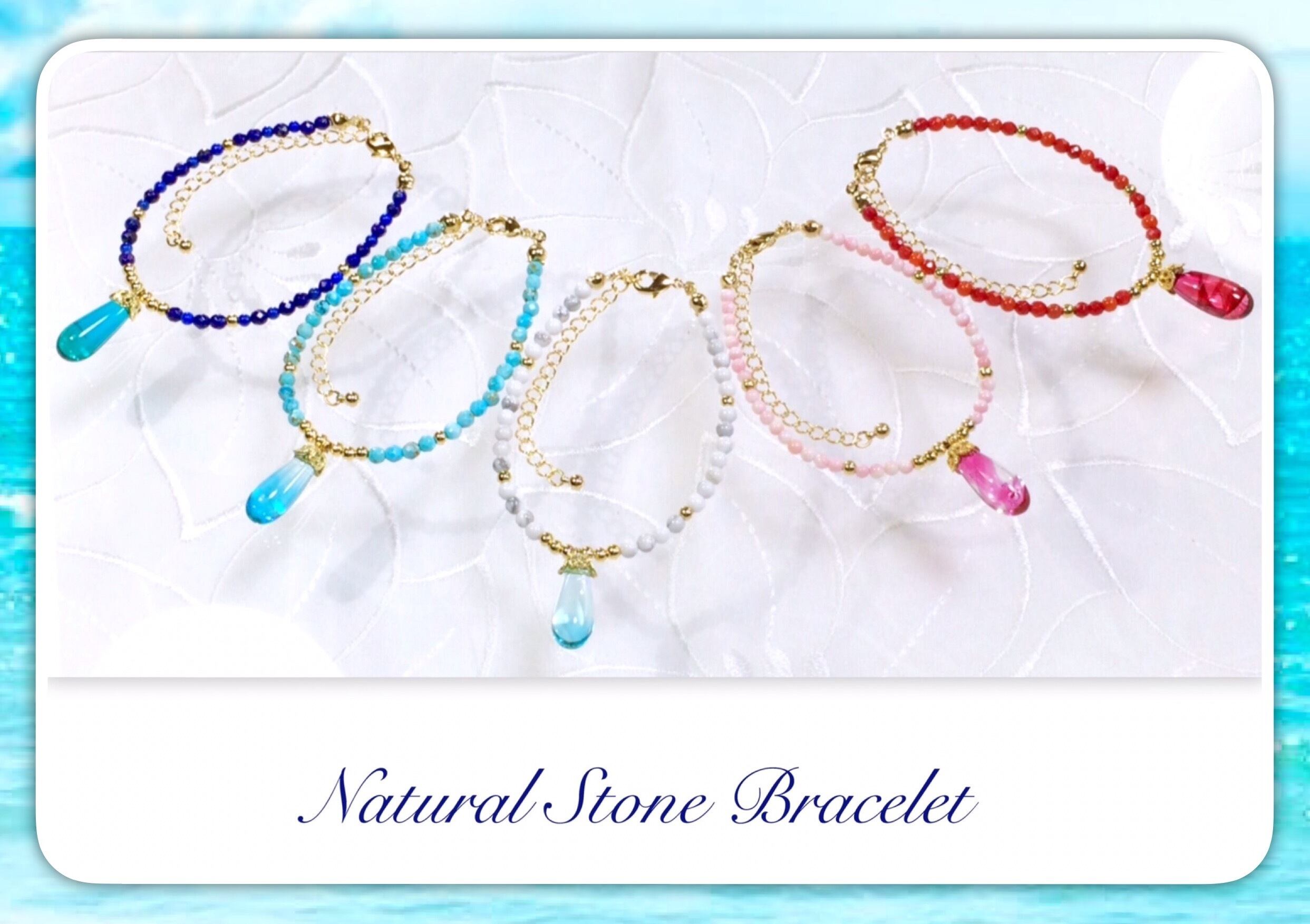 幸運を呼び寄せる石として人気の高い“ラピスラズリ”を使用した、華奢でシンプルなティアガラスブレスレット。夜空の様な輝きを持つ美しいラピスラズリと、カリブ海をイメージさせる神秘的なガラスの輝きが、モダンで洗練された大人の手元を演出してくれます☆