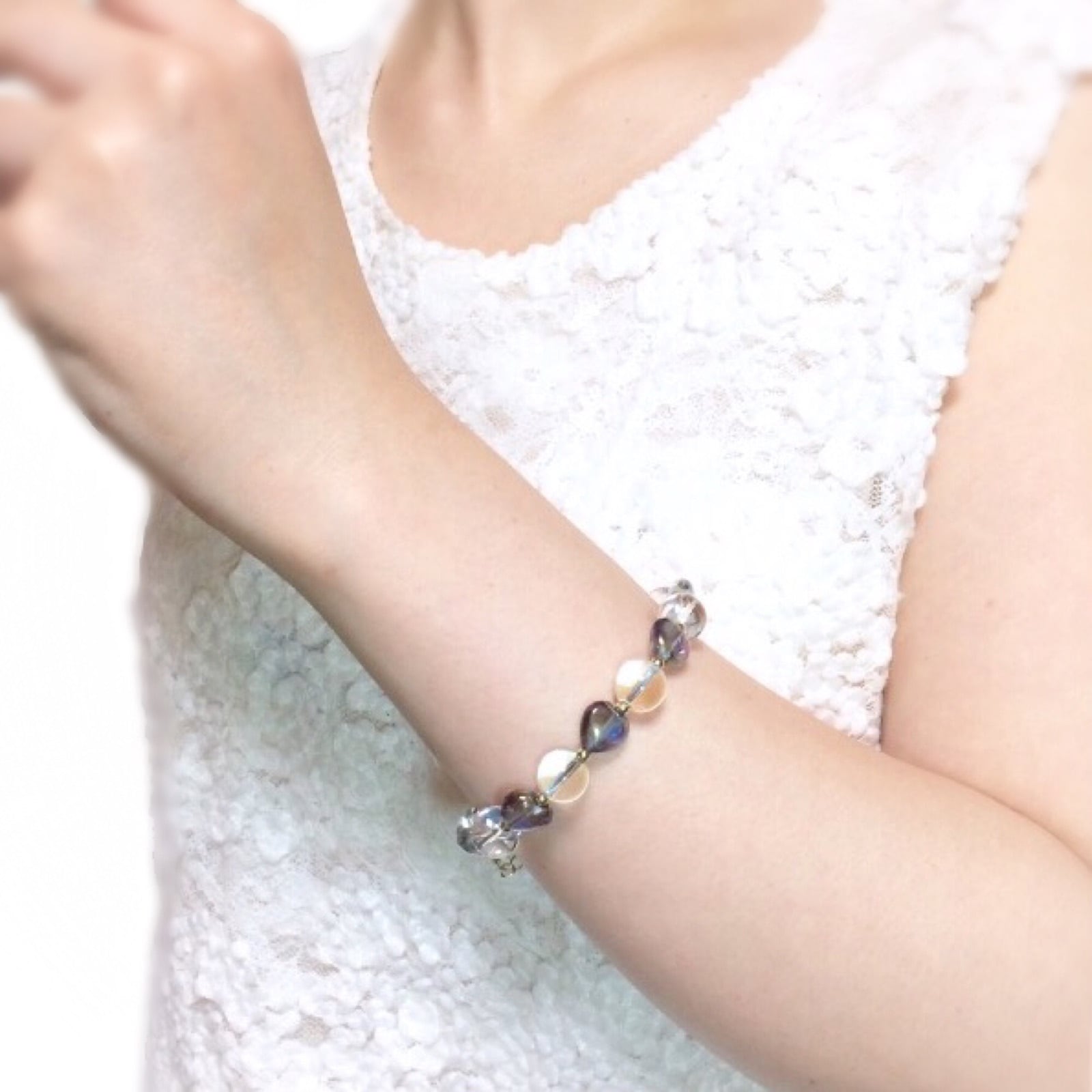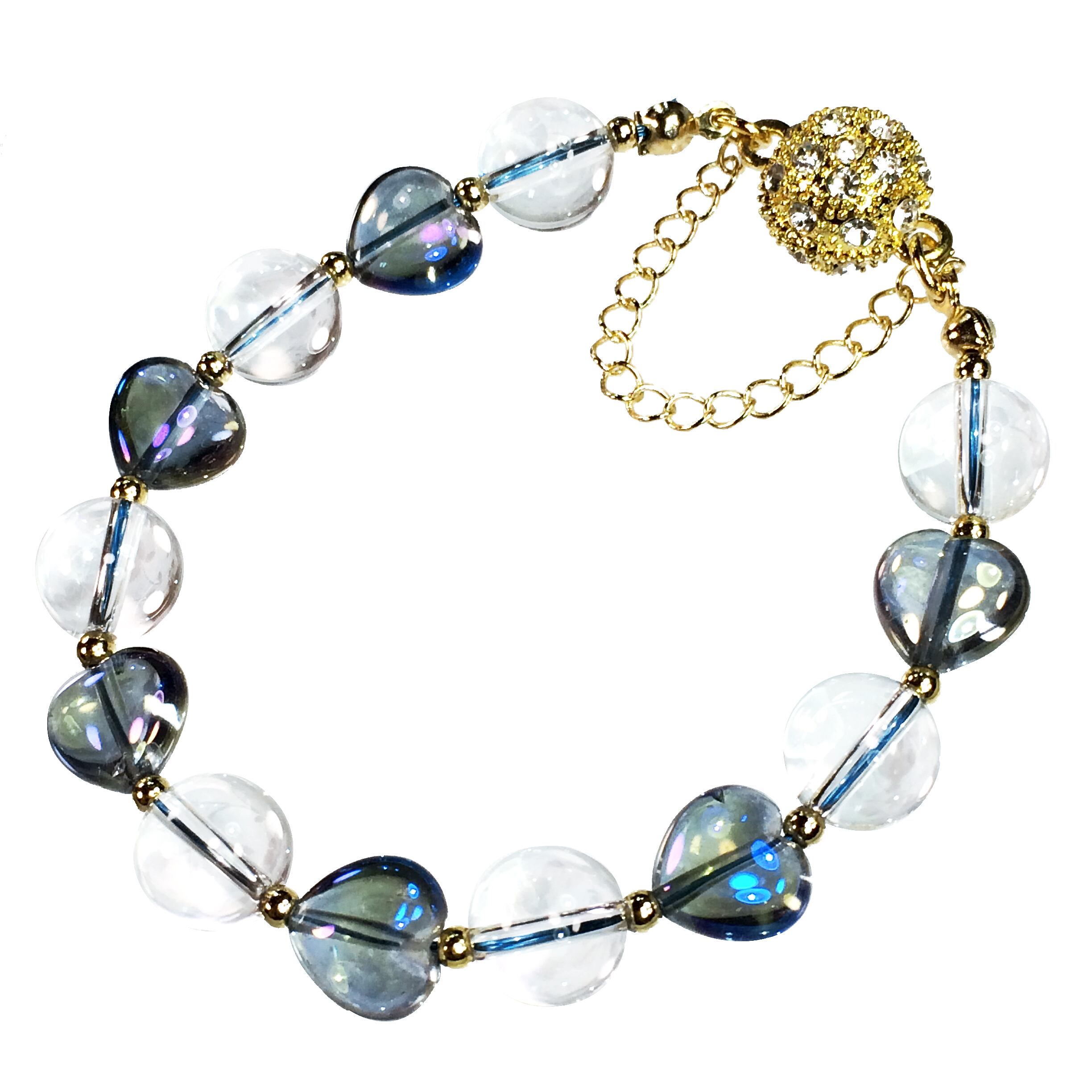 ダークブルーフラッシュコーティングを施した【♡水晶】と、美しい球体の【〇水晶】を組み合わせた、ダブル水晶ブレスレット。